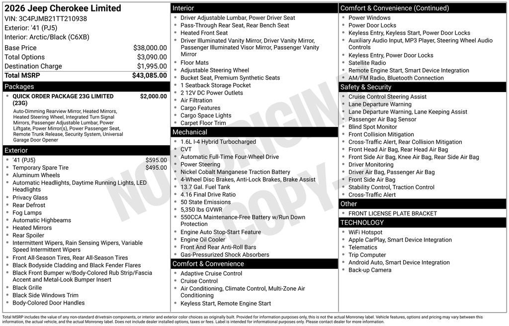 Lia Chrysler Jeep Dodge is honored to offer this charming 2026 Jeep Cherokee Limited in '41 Beautifully equipped with Quick Order Package 23G Limited (Auto-Dimming Rear-View Mirror, Capri Leatherette Perforated Seats, Cognac Interior Stitching, Exterior Mirrors Courtesy Lamps, Exterior Mirrors with Supplemental Signals, Gloss Black Mirrors, Heated Exterior Mirrors, Heated Steering Wheel, Limited Badge, Power 2-Way Passenger Lumbar Adjust, Power Adjust 6-Way Front Passenger Seat, Power Liftgate, Power Multi-Function Foldaway Mirrors, Security Alarm, Universal Garage Door Opener, and Wireless Charging Pad), 1.6L I4, 4-Wheel Disc Brakes, 4.16 Final Drive Ratio, 4G LTE Wi-Fi Hot Spot, 6 Speakers, ABS brakes, Air Conditioning, Alloy wheels, AM/FM radio: SiriusXM with 360L, Apple CarPlay, Apple CarPlay/Android Auto, Auto High-beam Headlights, Automatic temperature control, Brake assist, Compass, Delay-off headlights, Driver door bin, Driver vanity mirror, Dual front impact airbags, Dual front side impact airbags, Electronic Stability Control, Emergency communication system, Four wheel independent suspension, Front anti-roll bar, Front Bucket Seats, Front Center Armrest, Front dual zone A/C, Front fog lights, Front License Plate Bracket, Front reading lights, Fully automatic headlights, Global Telematics Box Module (TBM), Google Android Auto, GPS Antenna Input, Heated door mirrors, Heated front seats, Illuminated entry, Knee airbag, Low tire pressure warning, Occupant sensing airbag, Outside temperature display, Overhead airbag, Overhead console, Panic alarm, ParkView Rear Back-Up Camera, Passenger door bin, Passenger vanity mirror, Power door mirrors, Power driver seat, Power steering, Power windows, Radio data system, Radio: Uconnect 5 with 12.3 Display, Rain sensing wipers, Rear anti-roll bar, Rear reading lights, Rear seat center armrest, Rear side impact airbag, Rear window defroster, Rear window wiper, Remote Keyless Entry, SiriusXM with 360L, Soul Cloth Seats with Labyrinth Embossing, Speed control, Speed-sensing steering, Split folding rear seat, Spoiler, Steering wheel mounted audio controls, Tachometer, Telescoping steering wheel, Tilt steering wheel, Traction control, Trip computer, US/Canada Connectivity, Variably intermittent wipers, Voltmeter, and Wheels: 18 x 7 Machine Face Painted Aluminum!