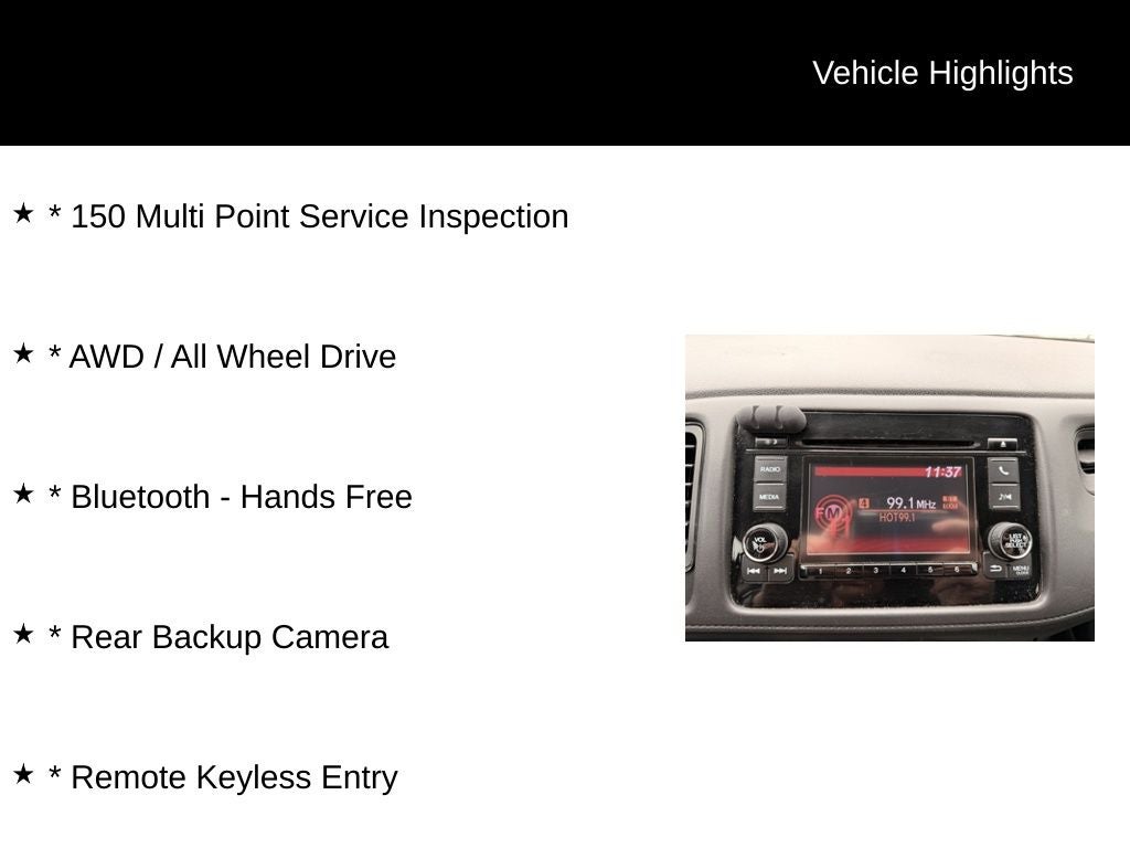 * 150 Multi Point Service Inspection, * AWD / All Wheel Drive, * Bluetooth® - Hands Free, * Rear Backup Camera, * Remote Keyless Entry, HR-V LX, AWD.