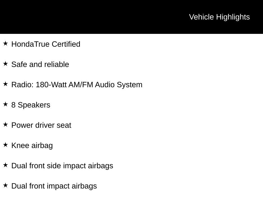 Certification Program Details: * The Honda Certified Pre-Owned Vehicle Limited Warranty provides non-powertrain coverage for 2 years or 100,000 miles(whichever comes first) beginning at the expiration of the New Vehicle Limited Warranty, or from the date of sale of the Honda Certified Pre-Owned Vehicle if the New Vehicle Limited Warranty has already expired. * Powertrain Limited Warranty: 84 Month or 100,000 Mile (whichever comes first) from original in-service date * Up to two complimentary oil changes within the first year of ownership. SiriusXM 90-Day Trial (if originally equipped in the vehicle) * Warranty Deductible: $0 * Roadside Assistance * 182 Point Inspection * Vehicle History Report