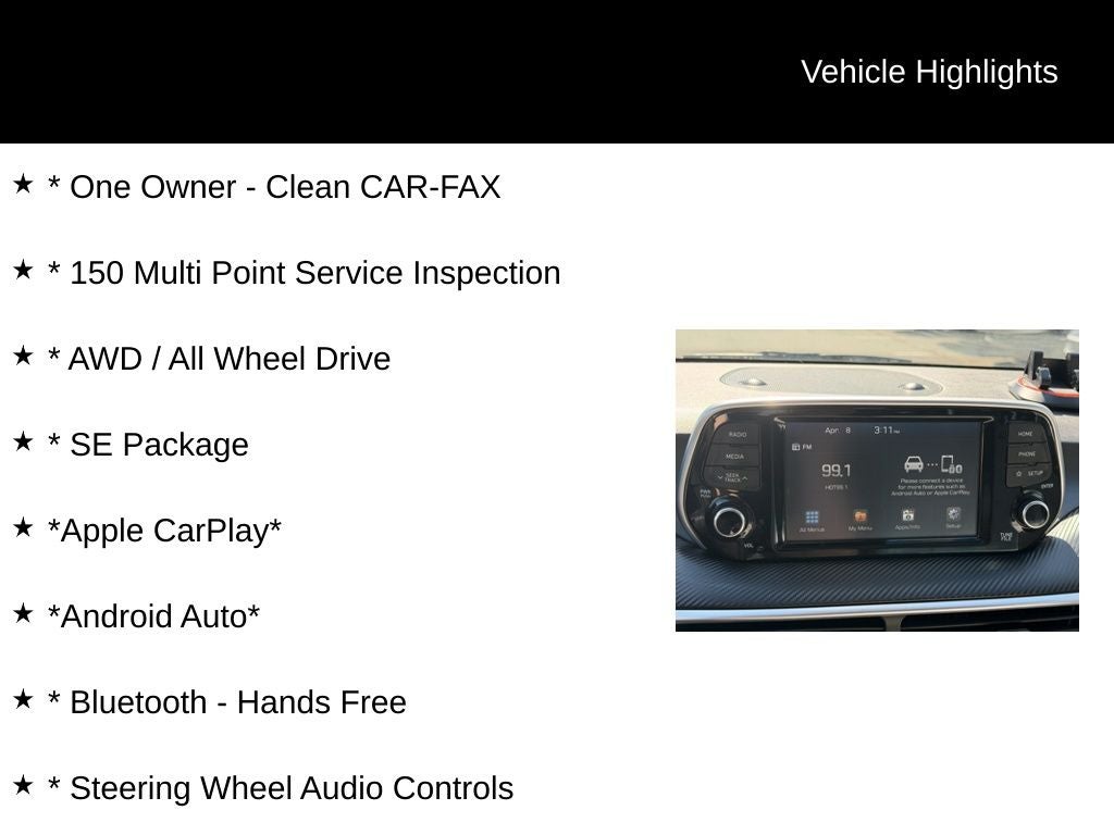 * One Owner - Clean CAR-FAX, * 150 Multi Point Service Inspection, * AWD / All Wheel Drive, * SE Package, *Apple CarPlay*, *Android Auto*, * Bluetooth® - Hands Free, * Steering Wheel Audio Controls, * Rear Backup Camera, * Lane Departure Warning, * Forward Collision Warning, Tucson SE, AWD.