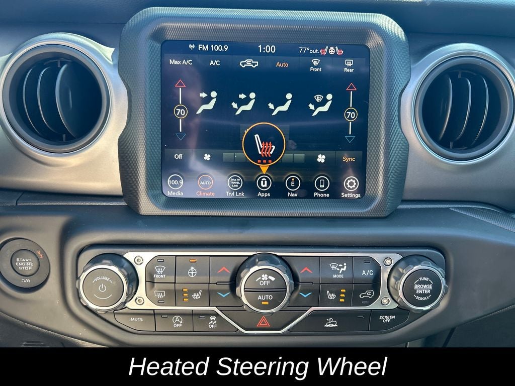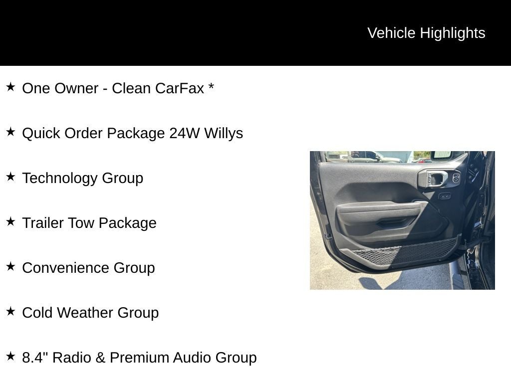 For your comfort and convenience, this Gladiator boasts air conditioning with automatic temperature control, a heated steering wheel, and heated front seats. The MOPAR Spray-In Bedliner and Protection Sill Rails provide added protection and durability, while the Willys styling cues and red-accented shock absorbers give this Jeep an unmistakable rugged appearance.