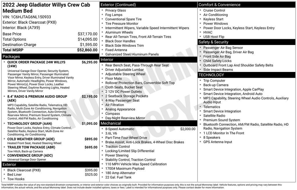 Equipped with a powerful 3.6L V6 engine and an 8-speed automatic transmission, the Gladiator Willys delivers exceptional performance and off-road prowess. Standout features include the Alpine Premium Audio System, Uconnect 4C Nav with an 8.4 display, and SiriusXM Satellite Radio, ensuring you stay connected and entertained on every journey.