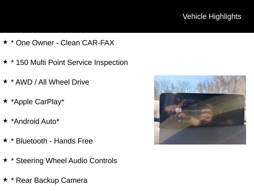 * One Owner - Clean CAR-FAX, * 150 Multi Point Service Inspection, * AWD / All Wheel Drive, *Apple CarPlay*, *Android Auto*, * Bluetooth® - Hands Free, * Steering Wheel Audio Controls, * Rear Backup Camera, * Lane Departure Warning, * Blind Spot Monitoring, * Rear Cross Traffic Alert, * Forward Collision Warning, * Pushbutton Start, * Remote Keyless Entry, * Power Drivers Seat, * Heated - Leather Seats, * Power Moonroof / Sunroof, * Dual-Zone Climate Control, * Sirius XM Radio, * Power Liftgate, * Premium Wheels, CX-5 2.5 S Carbon Edition, AWD.