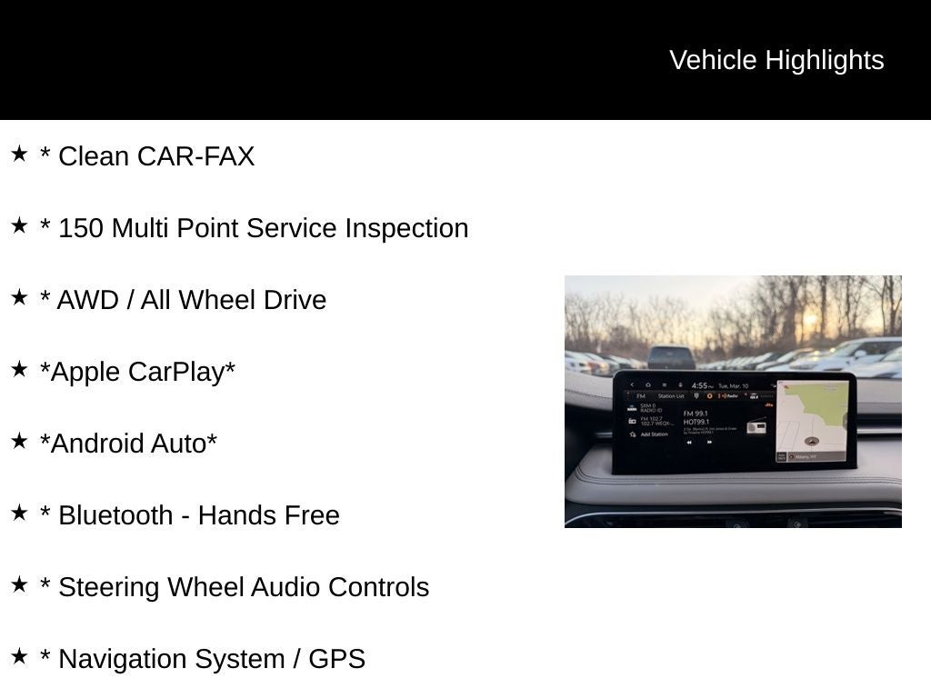 * Clean CAR-FAX, * 150 Multi Point Service Inspection, * AWD / All Wheel Drive, *Apple CarPlay*, *Android Auto*, * Bluetooth® - Hands Free, * Steering Wheel Audio Controls, * Navigation System / GPS, * Remote Vehicle Starter, * Rear Backup Camera, * Front and Rear Parking Sensors, * Adaptive Cruise Control, * Lane Departure Warning, * Blind Spot Monitoring, * Rear Cross Traffic Alert, * Forward Collision Warning, * Pushbutton Start, * Remote Keyless Entry, * Power Driver & Passenger Seats, * Heated - Leather Seats, * Heated & Cooled Seats, *Heated Steering Wheel*, * Power Moonroof / Sunroof, * Dual-Zone Climate Control, * Premium Sound System, * Sirius XM Radio, * Premium Wheels, G70 2.0T Sport Prestige, AWD.