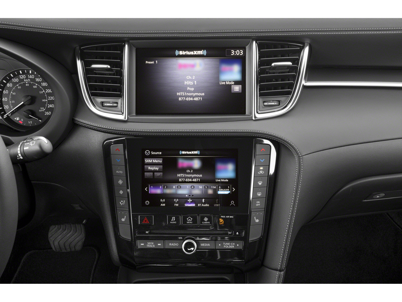 - Radio: AM/FM Audio System -inc: 6 speakers, INFINITI InTouch dual display system w/upper 8" and lower 7" HD touch screens, wireless Apple CarPlay and Android Auto, HD Radio technology, SiriusXM radio w/advanced audio features and 90-day complimentary trial, INFINITI voice recognition, INFINITI InTouch services, Siri eyes free and WiFi hotspot
