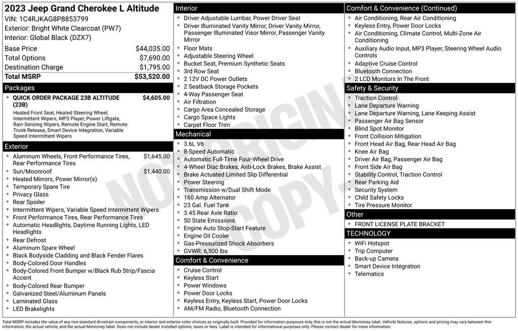 Elevate your driving experience with the 2023 Jeep Grand Cherokee L Altitude, a stunning SUV that blends unparalleled style, advanced technology, and exceptional off-road performance. This one-owner vehicle, with a clean CarFax history, is the perfect choice for those seeking a versatile and refined family hauler.