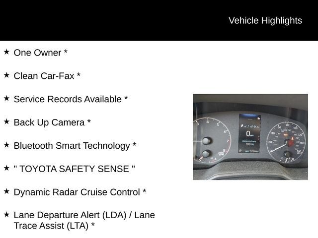 One Owner *, Clean Car-Fax *, Service Records Available *, Back Up Camera *, Bluetooth® Smart Technology *, TOYOTA SAFETY SENSE , Dynamic Radar Cruise Control *, Lane Departure Alert (LDA) / Lane Trace Assist (LTA) *, Pre-Collision System (PCS) w/Pedestrian Detection *, Automatic High Beams *, 17 Alloy Wheels, 6 Speakers, ABS brakes, AM/FM radio: SiriusXM, Automatic temperature control, Dual front impact airbags, Dual front side impact airbags, Fully automatic headlights, Heated door mirrors, Illuminated entry, Power door mirrors, Remote keyless entry.