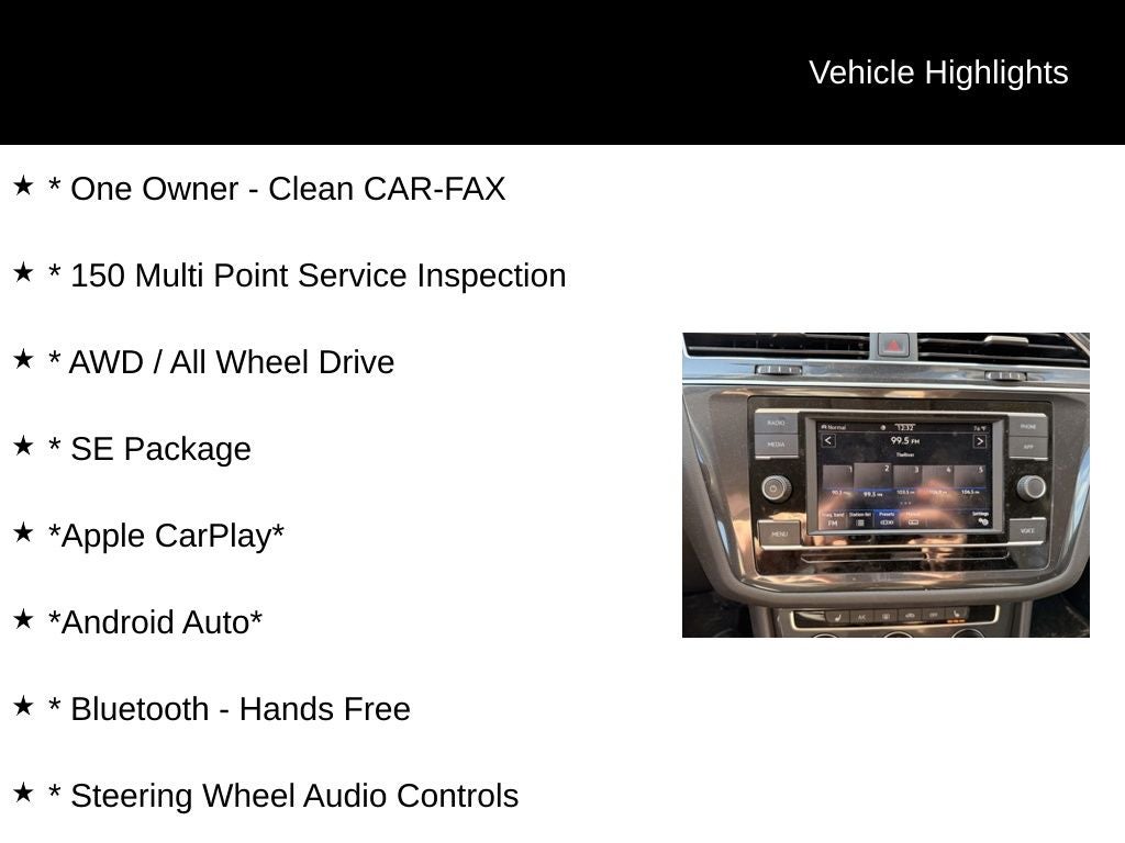 * One Owner - Clean CAR-FAX, * 150 Multi Point Service Inspection, * AWD / All Wheel Drive, * SE Package, *Apple CarPlay*, *Android Auto*, * Bluetooth® - Hands Free, * Steering Wheel Audio Controls, * Rear Backup Camera, * Adaptive Cruise Control, * Lane Departure Warning, * Heated Seats, * LED Headlights, Tiguan 2.0T S, AWD.