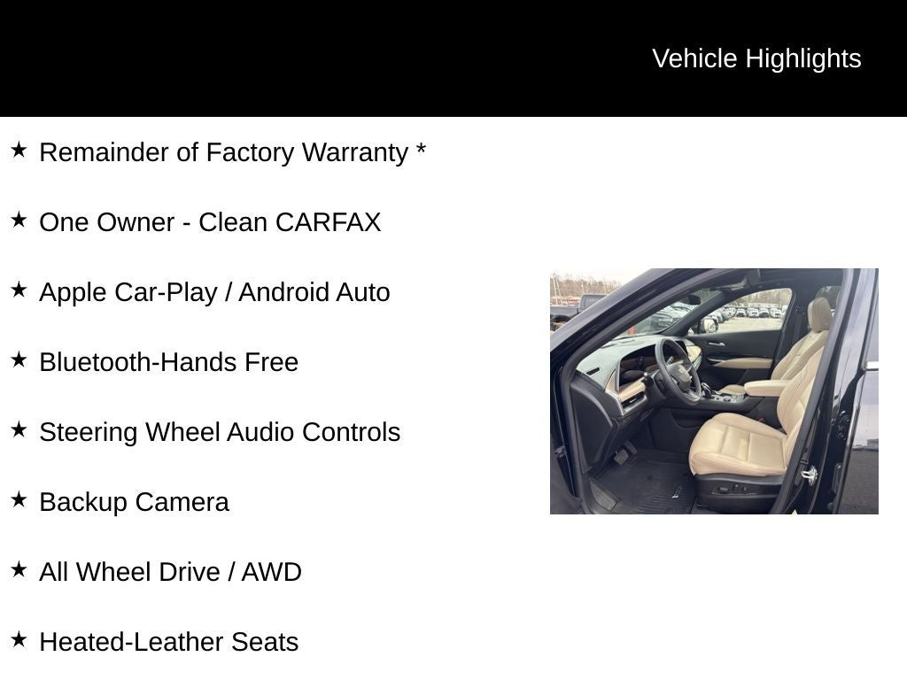 Remainder of Factory Warranty *, One Owner - Clean CARFAX, Apple Car-Play / Android Auto, Bluetooth-Hands Free, Steering Wheel Audio Controls, Backup Camera, All Wheel Drive / AWD, Heated-Leather Seats, Heated Steering Wheel, Push Button Start, Remote Vehicle Starter, Rear Parking Sensors, Adaptive Cruise Control, Lane Departure Warning, Blind Spot Monitoring, Rear Cross-Traffic Alert, Forward Collision Warning, Cruise Control, Power Liftgate. Odometer is 8046 miles below market average! 23/28 City/Highway MPG