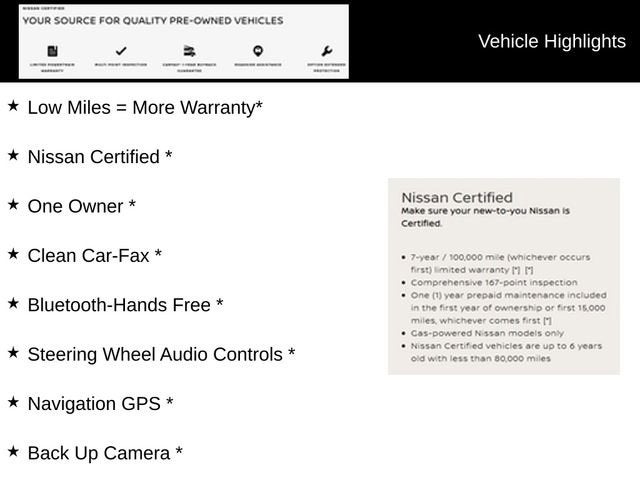 * 7 Year/100,000 Mile Limited Warranty, 24/7 Hour Roadside Assistance, Carfax Vehicle History Report, Plus 1 Year Pre-Paid Maintenance Included. Gas Powered Nissan Models Only.