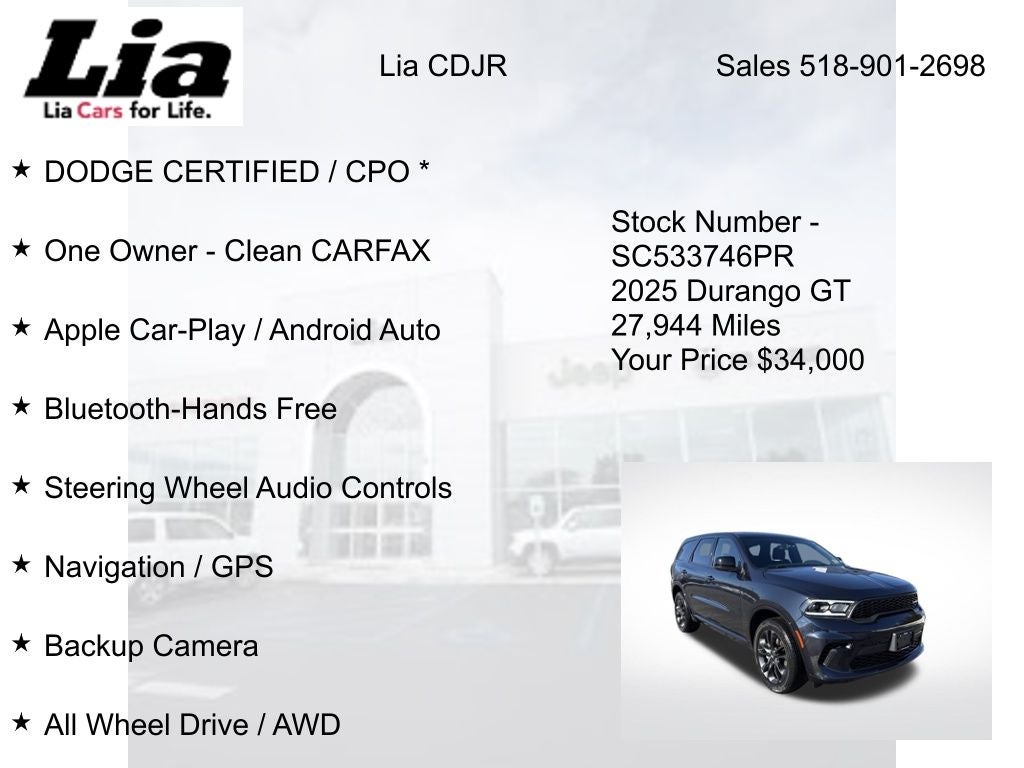 DODGE CERTIFIED / CPO *, One Owner - Clean CARFAX, Apple Car-Play / Android Auto, Bluetooth-Hands Free, Steering Wheel Audio Controls, Navigation / GPS, Backup Camera, All Wheel Drive / AWD, Heated-Leather Seats, Heated Steering Wheel, Push Button Start, Remote Vehicle Starter, Remote Keyless Entry, Dual Zone Auto-Climate Control, Premium Alloy Wheels, Front & Rear Parking Sensors, Lane Departure Warning, Blind Spot Monitoring, Full Power Options: Locks & Windows, Cruise Control, Power Liftgate, AWD.