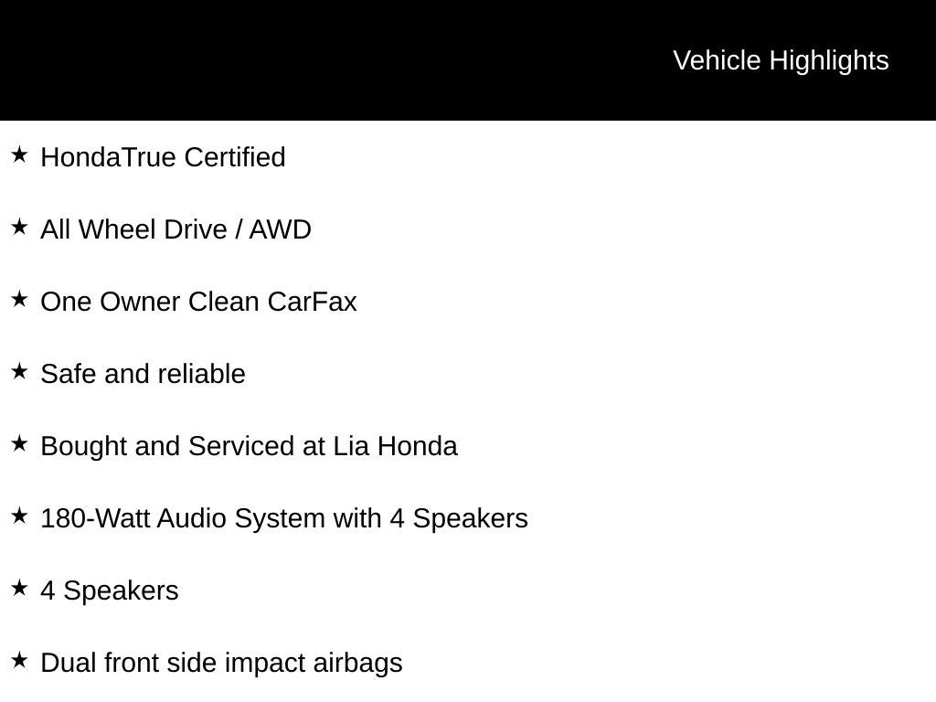 HondaTrue Certified, All Wheel Drive / AWD, One Owner Clean CarFax, Safe and reliable, Bought and Serviced at Lia Honda, 17 Silver Painted Alloy Wheels, 180-Watt Audio System with 4 Speakers, 4 Speakers, Adaptive Cruise Control: Adaptive Cruise Control (ACC) with Low-Speed Follow, Apple CarPlay/Android Auto, Dual front impact airbags, Dual front side impact airbags, Fully automatic headlights, Knee airbag, Rear side impact airbag.