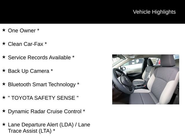 One Owner *, Clean Car-Fax *, Service Records Available *, Back Up Camera *, Bluetooth® Smart Technology *, TOYOTA SAFETY SENSE , Dynamic Radar Cruise Control *, Lane Departure Alert (LDA) / Lane Trace Assist (LTA) *, Pre-Collision System (PCS) w/Pedestrian Detection *, Automatic High Beams *, 6 Speakers, ABS brakes, AM/FM radio: SiriusXM, Apple CarPlay/Android Auto, Automatic temperature control, Dual front impact airbags, Dual front side impact airbags, Fully automatic headlights, Illuminated entry, Panic alarm, Power door mirrors, Remote keyless entry, Wheels: 16 Steel with Covers.
